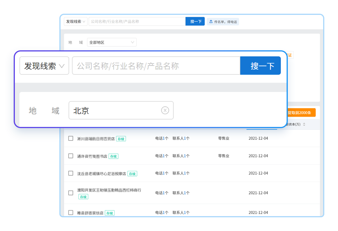 通过关键词搜索,如互联网、机械制造,或通过设置行业、地域、成立时间、企业规模等条件进行筛选。